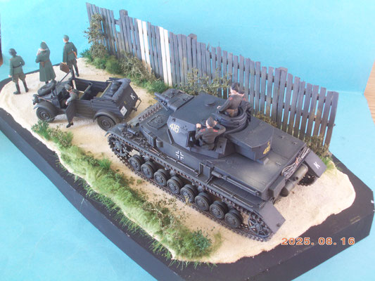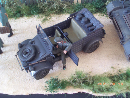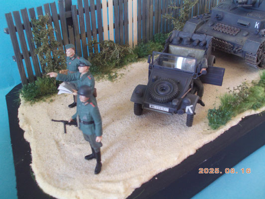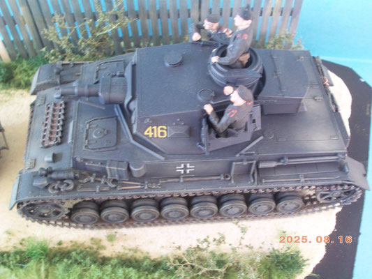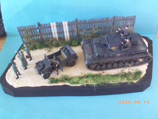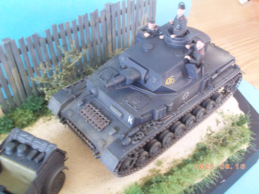 Jürgen P. stellte uns ein Diorama Russland 1942 vor. Es zeigt eine Pz. IV F1 von Tamiya in 1:35. Bausatz sehr detailliert, sehr gute Passgenauigkeit, keine Spachtelarbeiten erforderlich. 3 Figuren im Bausatz enthalten. Weiterhin auf dem Diorama ein VW-Typ 82. Bausatz ebenfalls von Tamiya, aber neue Form perfekt im Detail + 1 Figur. Das Basteln war eine wahre Freude, eben Tamiya.