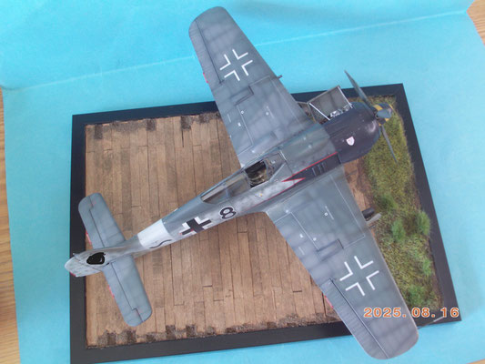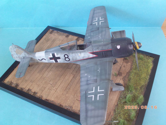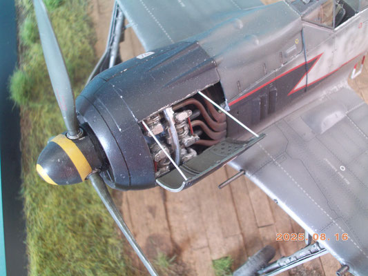 Ralf hat Viel Modifiziert z.B. Eduard Instrumente und Gurtzeug, Eduard Teile für Motor, Bremsleitungen aus Draht, Antennen, Tragflächen mit Nietenreihen versehen. Lackierungen Basis Tamiya schwarz, aufgehellt, Adlerschwingen frei Hand etappenweise aufgebaut und alles gealtert. Bericht auf Webseite einsehbar. Decals von Eagle Cals und aus dem Bausatz. Das Ganze Modell auf einer Base aus einem Bilderrahmen, Holzstäbchen, Static Gras und Grasbüscheln von Green- Stuff-World. Das alles mit Erde, Wasser und Holzleim gemischt und mit Braun-grauer Wasserfarbe lasiert und mit Löffel aufgetragen. Perfekt gemacht siehe Bilder. Tolles Modell einfach perfekt.